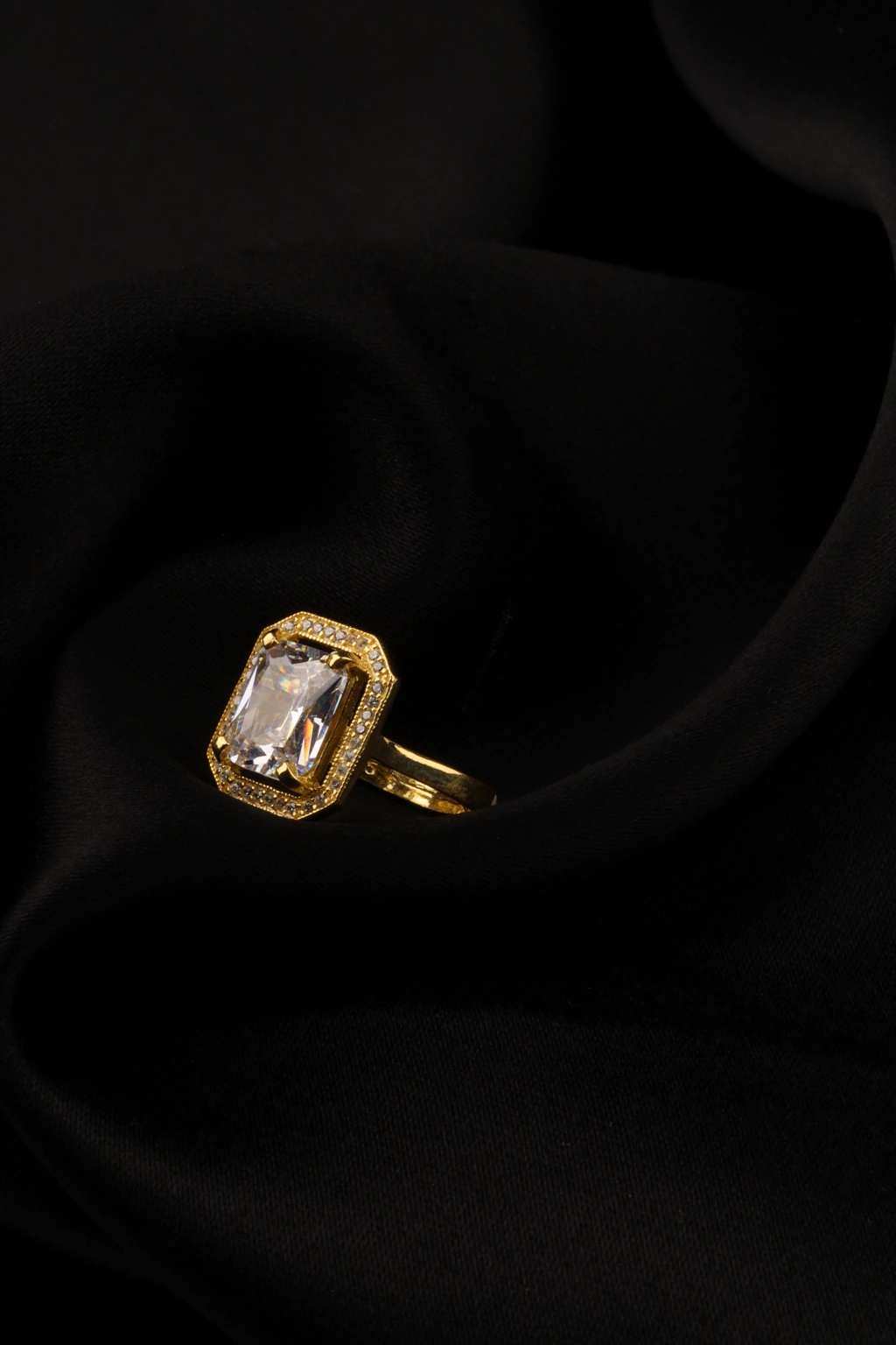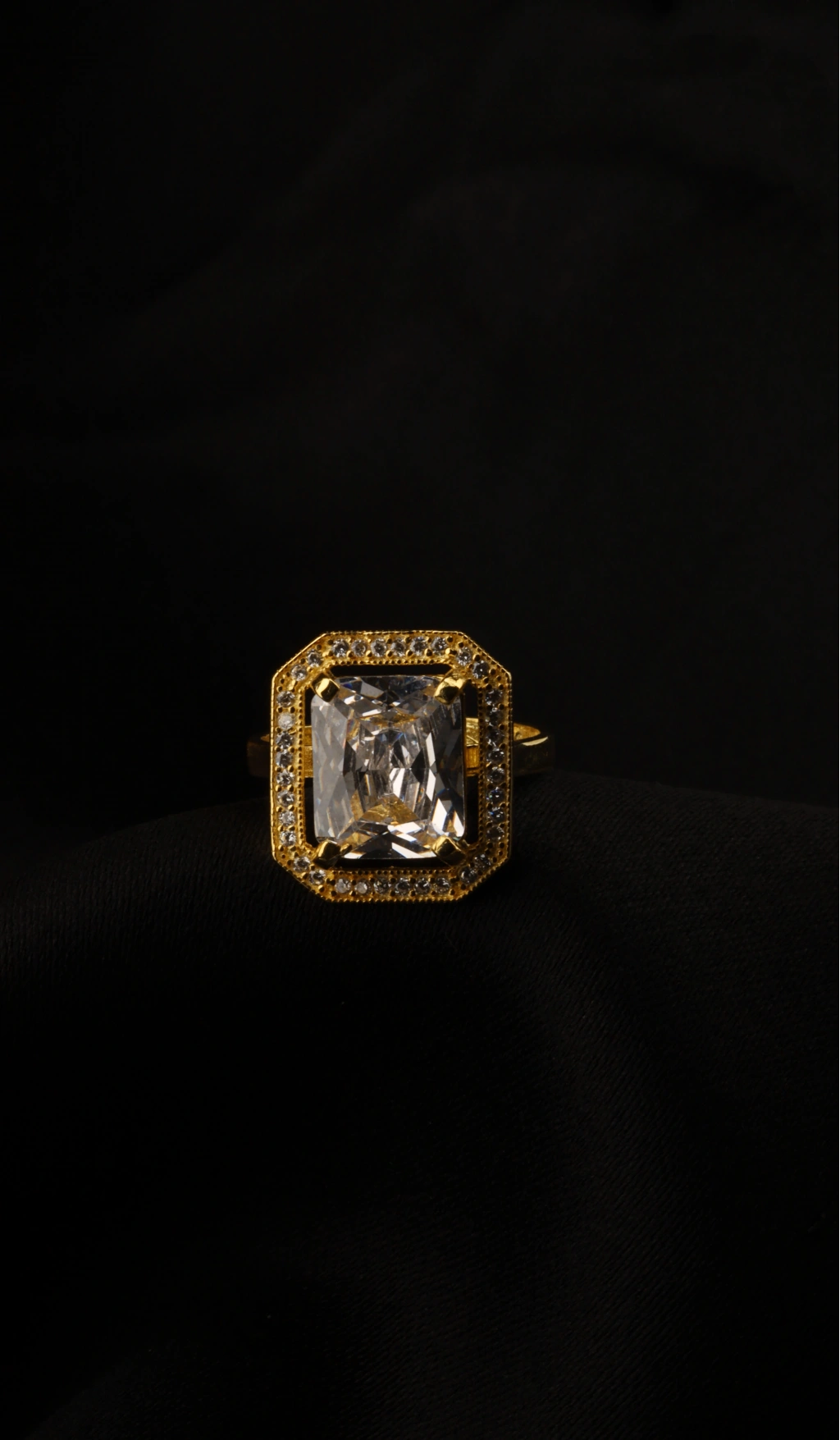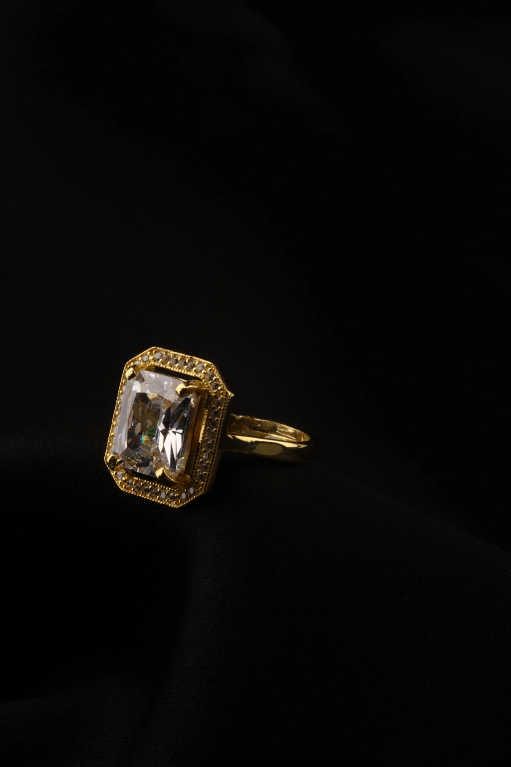 Merkezdeki iri baget kesim zirkon taş, keskin hatları sayesinde prizma gibi ışığı yansıtırken; etrafındaki çift sıralı halo (hale) çerçevesi, ana taşı çevreleyen ekstra pırıltı katmanı yaratır