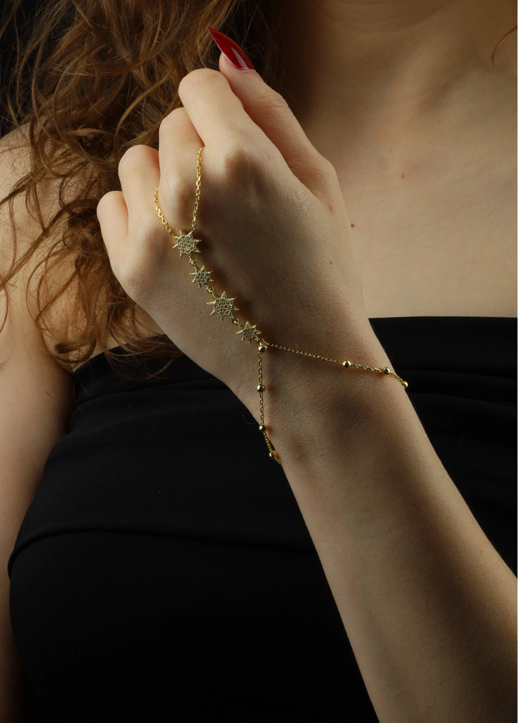 Zarafeti kaliteyle birleştiren bu özel tasarım şahmeran, yıldızların ışıltısını parmak uçlarınızdan bileğinize taşıyor. 925 Ayar Gümüş üzerine yapılan yüksek kaliteli altın kaplaması ve el işçiliği detaylarıyla, stilinize zamansız bir değer katıyor.