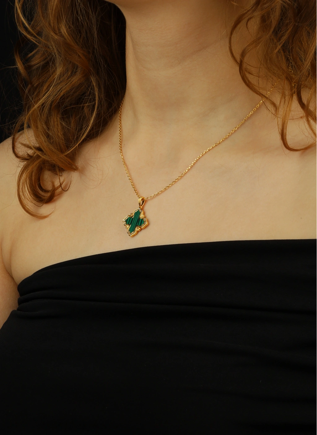 Malakit Taşının Büyüsü: Doğal çizgileriyle bilinen yeşil malakit taşı, merkeze yerleşerek tasarıma asalet katar. Çevresindeki mikro zirkon taşlar ise gün boyu ışıltınızı yansıtır.