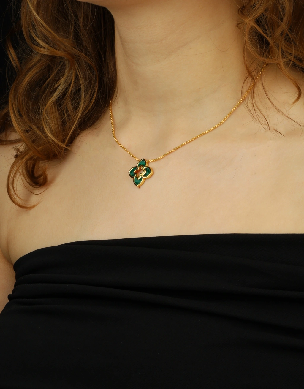 Karakteristik Malakit Dokusu: Kolyenin merkezindeki çiçek yaprakları, doğanın eşsiz desenlerini taşıyan yeşil malakit dokusuyla zenginleştirilmiştir.