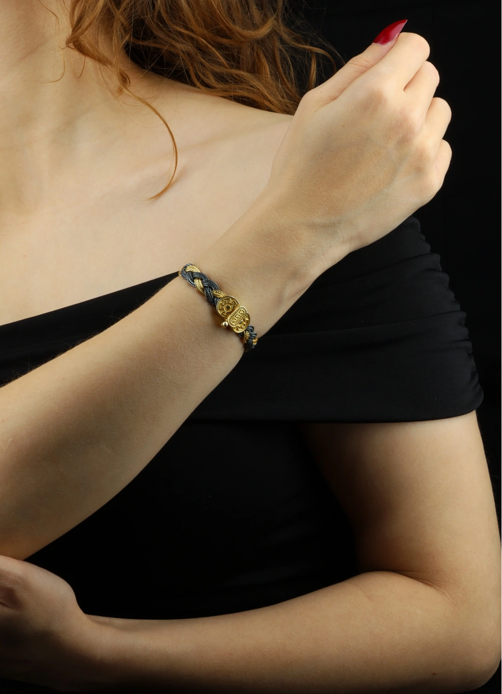 Siyah bölümler bilekliğimizin üzerine oksit uygulanarak, gold kısımlar gümüş üzerine altın kaplama yapılarak elde edilmiştir.