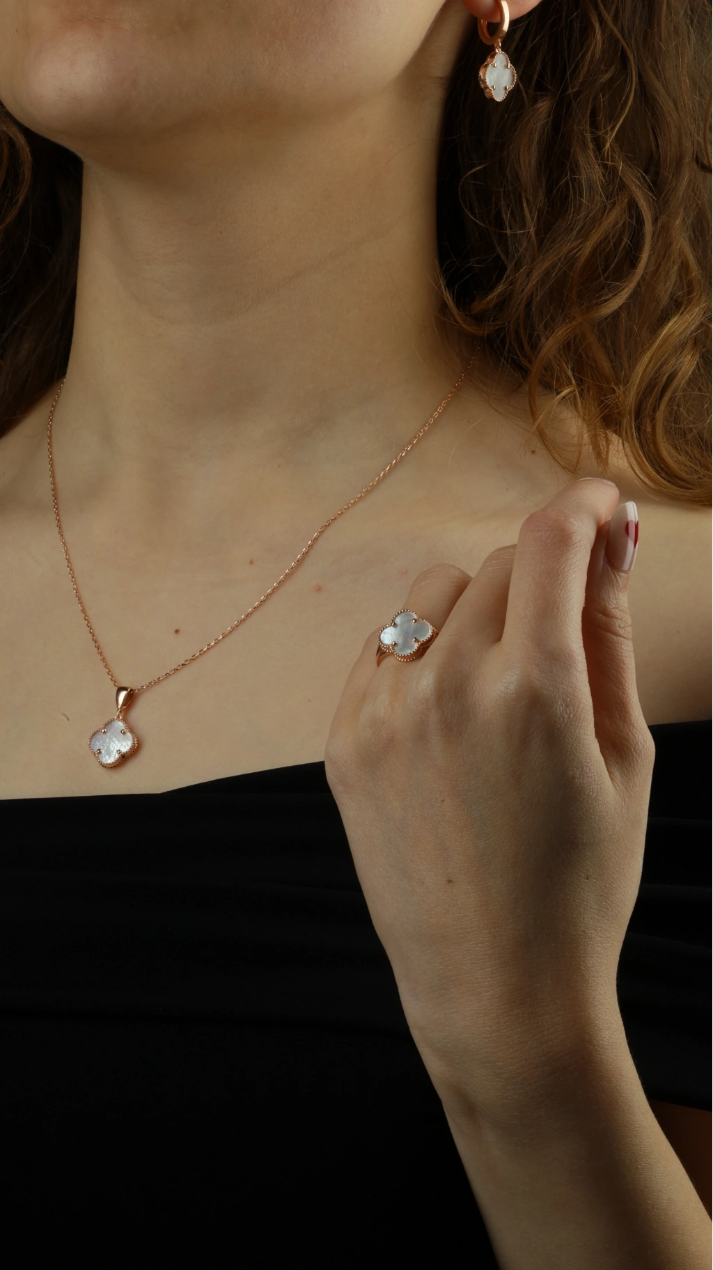 Şansın ve saflığın simgesi olan yonca formunu, 925 ayar gümüşün kalitesiyle yeniden yorumladık. Bu özel set; kolye, küpe ve yüzükten oluşan kusursuz bir uyum sunuyor.