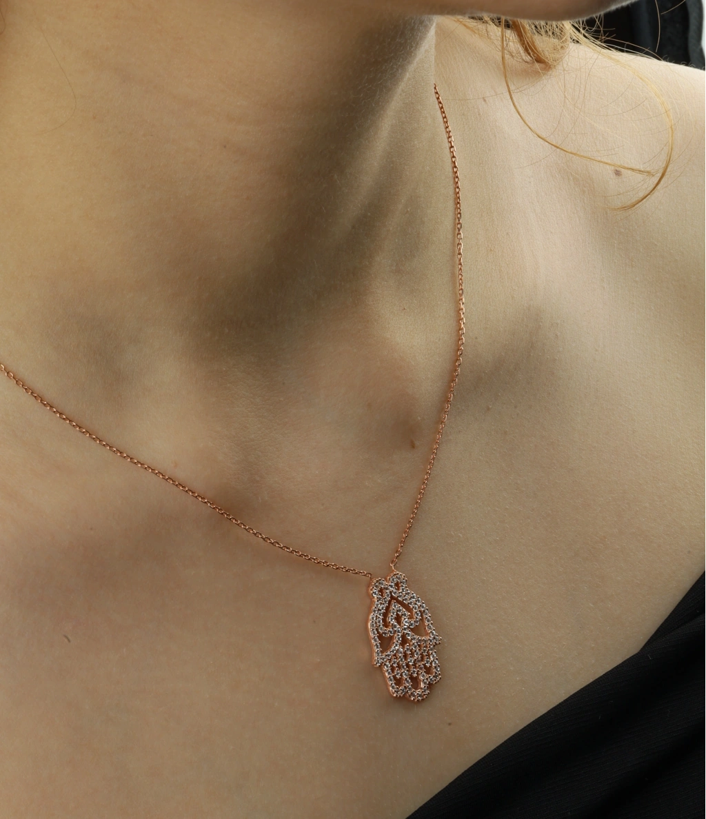 İnce İşçilik: Geleneksel Hamsa (Fatma Eli) motifi, her noktasına titizlikle yerleştirilmiş parlak zirkon taşlarla zenginleştirilmiştir.