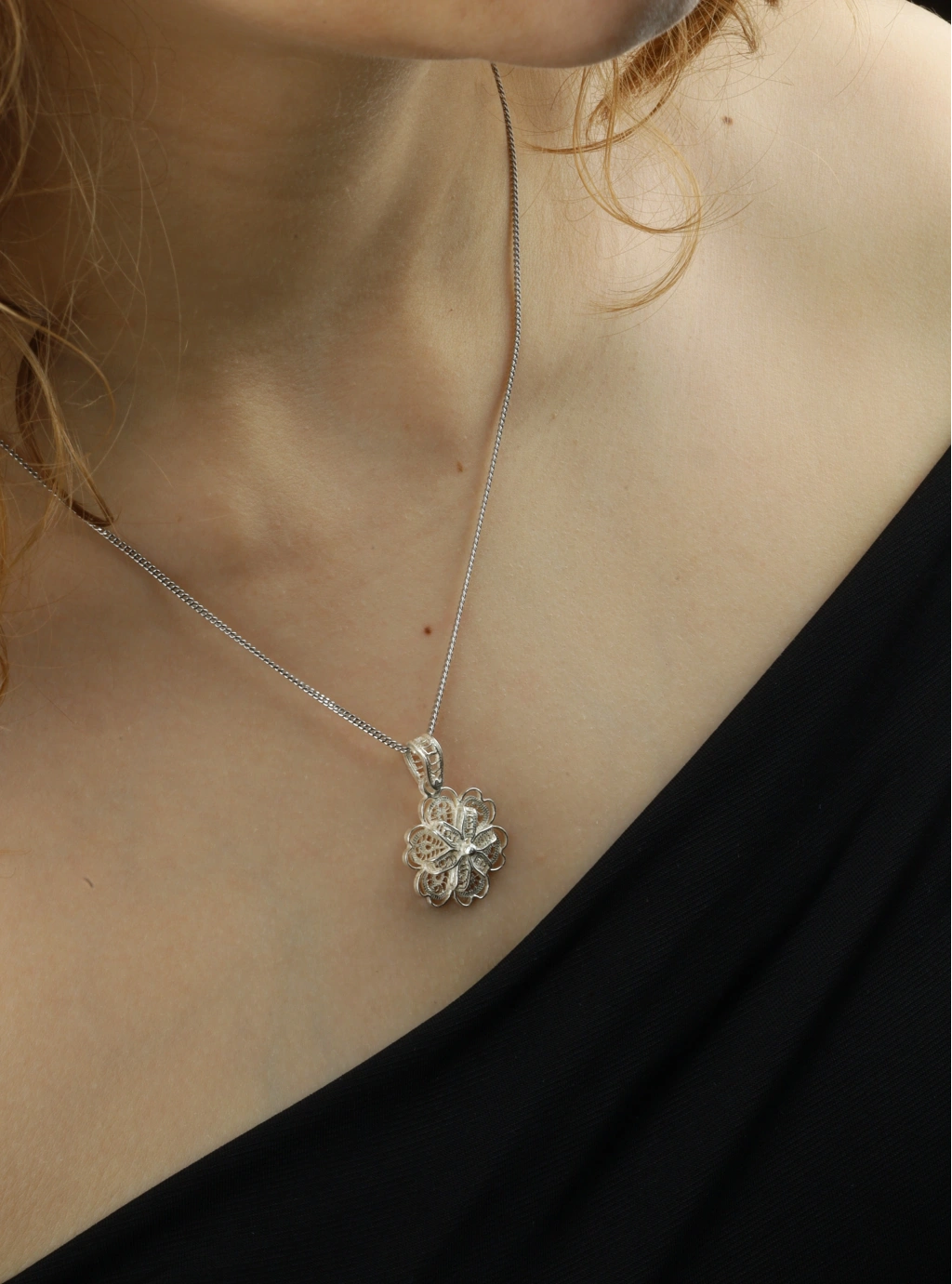 Otantik Tasarım: Papatya figürünün telkari tekniğiyle birleşimi, kolyeye göz alıcı ve otantik bir hava katarak bakışları üzerinize çeker.