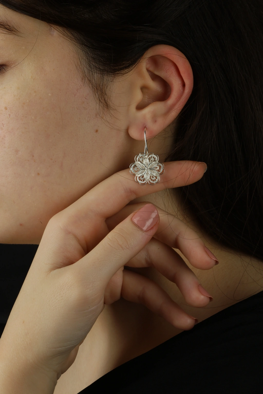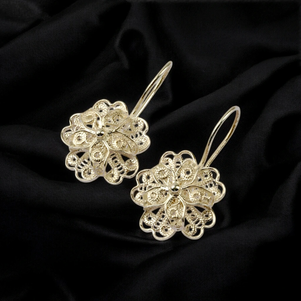 Otantik Tasarım: Papatya figürünün telkari tekniğiyle birleşimi, küpelere göz alıcı ve otantik bir hava katar.